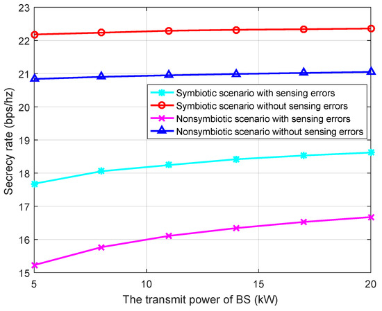 In this section, the numerical results on the secrecy rate performance of the proposed network are presented. To this end, unless stated otherwise, the parameter values in Table 2 are used. The channel power gains are modeled as , where x and y represent channel short-term fading and path-loss exponent, respectively. It is assumed that x = y = 1, and all channel gains have found depending on the distance d. In addition, the channel gains are modeled as quasi-static flat fading, which remains constant over the period T seconds, but may vary in different periods [12,23]. In this study, the performance of proposed scenario is evaluated by comparing it with other three baseline schemes, i.e., a symbiotic scenario without sensing errors, a nonsymbiotic scenario with sensing errors, and a nonsymbiotic scenario without sensing errors.