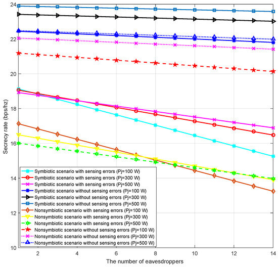 The variation in the secrecy rate of the system according to the number of eavesdroppers is shown in Figure 8. As the ED number increases, system performance decreases. The symbiotic relationship between HT and BS and with no sensing error, perfect detection of the active or passive state of the BS improves the system performance. As seen from the results obtained, the symbiotic scenario without sensing errors ( = 500 W) shows the best performance at all values of the ED number. Since the increase in the signal transmission power of the Jammer increases the energy harvested by the HT, the number of bits transmitted to the IR by the HT increases. Thus, a certain increase in the number of bits reaching ED is observed. However, the jammer disrupts the signal reaching the ED, resulting in a decrease in the SNR value. Therefore, increasing improves the secrecy rate. For example, the symbiotic scenario with sensing errors ( = 300 W) performs better than the symbiotic scenario with sensing errors ( = 100 W) after N = 2, while the symbiotic scenario with sensing errors ( = 500 W) performs better than the symbiotic scenario with sensing errors ( = 300 W) after N = 5. The results obtained for all values in the symbiotic scenario with sensing errors are higher than those of the nonsymbiotic scenario with sensing errors. This result clearly shows the advantage of symbiotic design of the proposed system. In the absence of detection errors, the system performance is resistant to , so an increase in the number of EDs produces a slow decrease in . In the presence of a sensing error, it is an expected result that the system becomes vulnerable to eavesdropping.