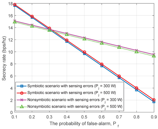 The change in the secrecy rate according to is shown in Figure 9. In this simulation, it is assumed that N = 8. As the probability of a false alarm () increases, the performance of the system decreases. This decrease exhibits a linear behavior according to Equation (25). An increment in increases and shortens . The nonsymbiotic scenario is a typical wireless powered communication system with an energy-harvesting-then-transmitting protocol, with the silent BS–active HT scenario accounting for most of the number of transmitted bits. At this point, decreasing the time reduces the number of bits transmitted to the IR.