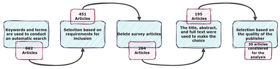 The current investigation’s pursuit and selection procedures are divided into four separate phases, as seen in Figure 1. Our paper conducts a robust systematic method to review the literature on ML-enabled ISs in multi-objective healthcare management, directly addressing an apparently given structured methodology. In the first step, a thorough list of keywords and phrases was used to search various sources, as shown in Table 2. An electronic database was used to obtain pertinent materials, which included chapters, journals, technical studies, conference papers, notes, and special issues, for a total of 662 publications. We performed a holistic search through databases, consisting of ScienceDirect, PubMed, IEEE Xplore, and SpringerLink, applying keywords such as “ML” and “multi-objective healthcare” and terms related to models, such as diagnostic and treatment planning. Boolean operators extended the search, and filters restricted the outcomes to research from the last five years (2018–2023) to capture the latest developments. To ensure objectivity, we leveraged a two-level screening. Initially, titles and abstracts were screened for pertinence, and therefore, full-text reviews verified the papers that met our particular inclusion metrics, including related research questions, the application of ML frameworks, and reporting fundamental criteria such as AUC-ROC and F1 Score. Our exclusion standards omitted non-English papers, reviews, and papers without empirical data. This led to an ultimate selection of 451 papers, adhering to a systematic review process throughout, ensuring transparency and consistency in our evaluation. To refine our selection, we leveraged particular quality metrics to ensure that the final papers were from valuable sources. We prioritized journals with highly influenced criteria and those indexed in respected academic databases, like PubMed, Scopus, Web of Science, and IEEE Xplore, which maintain robust editorial criteria. In addition, we concentrated on publications from well-defined academic publishers, consisting of IEEE, Springer, Elsevier, Wiley, and Taylor & Francis, known for their quality control and robust peer-review procedures. These quality criteria enabled us to select 36 papers from reputable sources, as indicated in Figure 1, thus improving the dependability and scholarly incorporation of our investigation. Figure 2 depicts the distribution of publications throughout the initial phase, with 451 articles remaining after the first phase. During the following step, the titles and abstracts of the chosen articles were thoroughly examined, with a particular emphasis on their discussion, methodology, analysis, and conclusion, to guarantee their conformity with the study’s goals. As seen in Figure 3, only 284 publications remained following the initial filtering. The goal was to choose publications that satisfied the predefined criteria for the study. After careful consideration, 195 articles were manually chosen to investigate further publications relevant to Figure 4. The final stage, as shown in Figure 5 and Figure 6, involves selecting 30 publications for the final phase of the study. In the next part, we look at many updated research articles on various IISs.