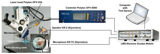 The response of the system, that is the velocities of the reference points on the oval window and the stapes footplate, were measured using an LDV system produced by Polytec GmbH, Waldbronn, Germany. The system consisted of an OFV-5000 controller and an OFV-534 laser scanning head. A He-Ne laser beam was directed at retro-reflective markers through the artificial external ear canal. The measured velocity signals were transmitted from the controller to the LMS-Siemens Scadas Mobile data acquisition analyser and then sent to the PC for data recording and processing via the TestXpress software (TestXpress 13) (see Figure 1).