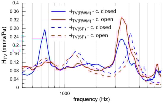 For the closed canal, two frequency zones of HTV(RWM)/HTV(SF) ratio amplification are observed. The first one corresponds to the 550–700 Hz interval with a peak of 2.1; the second amplification zone is 2–3.8 kHz, with the highest recorded amplification of 2.35.