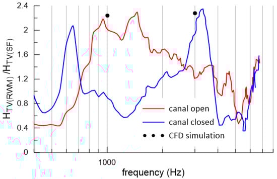 FRF ratios (HTV(RWM)/HTV(SF)) measured for the RWM (HTV(RWM)) and the stapes footplate (HTV(SF)) from experiments with open (red) and closed (blue) canals. Black points represent outcomes from CFD simulations.