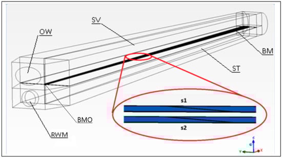 A simplified 3D model for numerical calculations of cochlea dynamics, including crucial elements such as the oval window, the round window, and the basilar membrane between the scala vestibuli and scala tympani, has been developed (Figure 4). The key feature of the model is its representation of the basilar membrane as two independent surfaces (s1 and s2) separated by a gap, with each of these surfaces discretized into independent and not connected finite sections. The elements are arranged in pairs, which means each element on one surface has a corresponding one on the other surface. In this simplified model, the external auditory canal and the ossicles are not taken into consideration. Hence, there is no comparison to the open and closed canals from the previous section.