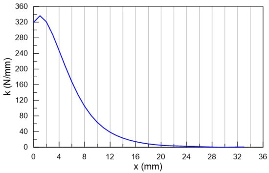 The equivalent parameters of the proposed basilar membrane model were determined through additional, independent finite element method simulations. In these calculations, the membrane was subjected to a constant uniform pressure, causing it to deform. The resulting deformation was referenced to a fixed coordinate system. Based on the known deformation of each element and its force load (calculated by multiplying pressure and surface area), the stiffness coefficient k of each individual element was determined (Figure 5).