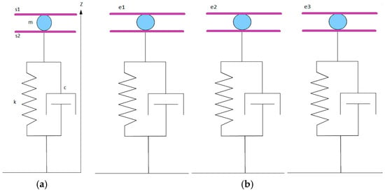 (a) Single spring–damper element of the basilar membrane model: k—spring element, c—damper element, m—mass of the element, s1 and s2—surface 1 and surface 2. (b) Independent spring–damper elements (e1, e2, e3) constitute the basilar membrane.