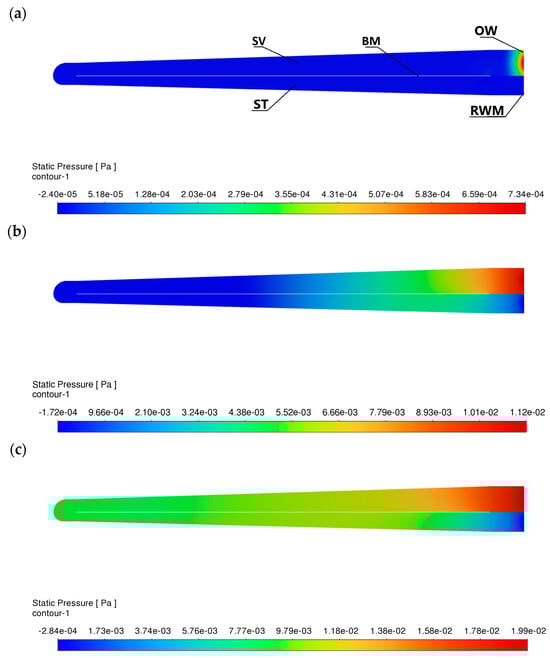 The initial stages of the inner-ear simulation with a visible traveling pressure wave: (a)—3.75 × 10−6 s; (b)—1.5 × 10−5 s; (c)—3.0 × 10−5 s.