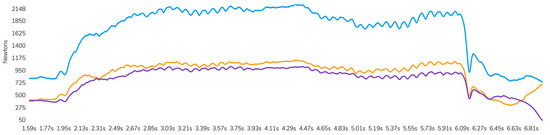 Isometric F-T curve representative of a participant. The purple line represents the vGRF of the left leg, the orange line represents the vGRF of the right leg, and the blue line represents the sum of both vGRFs.