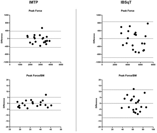 Bland–Altman plots of peak force and peak force relative to body weight in the isometric mid-thigh pull (IMTP) and isometric belt squat test (IBSqT). Dashed lines represent the value of zero and the limits of agreement for the test-retest evaluations.