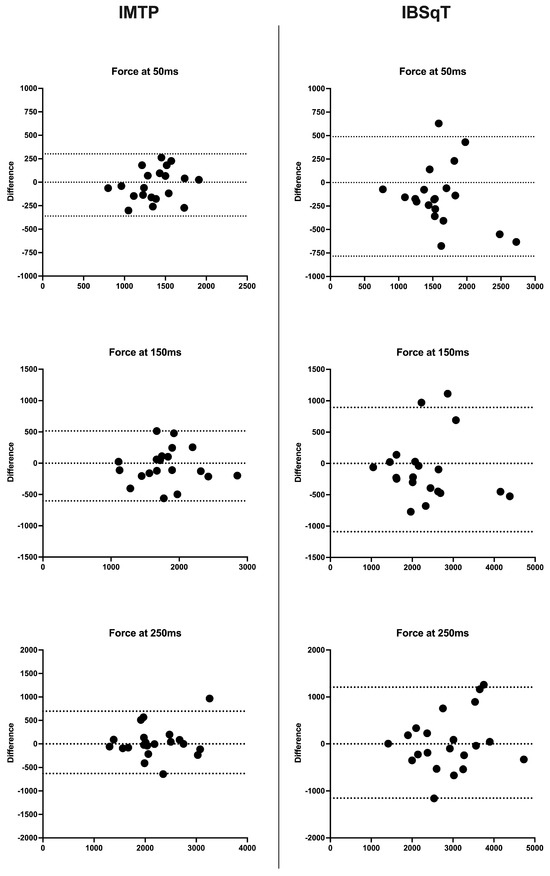 Descriptive characteristics were calculated, and the results were presented as means and standard deviations (SD). All the force-time data were analyzed using a custom spreadsheet. G*Power software (v3.1.9.7) was used to calculate the statistical power post hoc. The correlation: the point biserial model statistical test was applied, with a coefficient of determination (r2) of 0.69 for the peak force during the IMTP. The alpha error was set at 0.05, and the sample consisted of 21 subjects. The calculations indicated that the statistical power of the analysis was 0.98. The Shapiro–Wilk test was performed to assess data normality. Levene’s test was used to verify the homogeneity of the analyzed variables. ICC (3.1 model), CV, and 95% CIs were calculated to assess the intra- and inter-session reliability of both tests using a custom Excel spreadsheet [35]. Reliability was categorized as follows: ICC ≤ 0.5 indicated poor reliability, values ≤ 0.75 indicated moderate reliability, values ≤ 0.9 indicated good reliability, and values > 0.90 indicated excellent reliability [36]. The acceptable CV threshold was set at ≤10% [37]. Paired t-tests with a significance level of p ≤ 0.05 were used to determine if there were differences in PF, RPF, RFD 0–50; 0–100; 0–150; 0–200; 0–250, Force at 50; 100; 150; 200; 250 ms, and impulse 0–50; 0–100; 0–150; 0–200; 0–250 produced by IMTP and IBSqT across sessions. Hedges’ g was used to determine the effect size of group differences in test-retest scores, using Cohen’s scale as trivial (g < 0.2), small (0.2 ≤ g < 0.5), moderate (0.5 ≤ g < 0.8), and large (g ≥ 0.8) [38]. The standard error of measurement (SEM) provided an indication of score precision [39] and was used to understand whether differences in measurements were real or due to error [37]. The smallest worthwhile change (SWC) was determined by multiplying the between-subject SD by 0.2 (SWC0.2), which represents a typical small effect, or 0.5 (SWC0.5) for a medium effect [40]. SWC/SEM was calculated to determine whether a test could detect changes greater than the error, with values below 1.0 indicating that it was unlikely for the measure to detect changes larger than the error [41]. The limits of agreement corresponding to 1.96 SD of the bias (LoA) and 95% CI between the test-retest evaluations were determined from Bland–Altman plots. All statistical analyses were performed using IBM SPSS v26 statistical software (SPSS Inc., Chicago, IL, USA) and GraphpadPrism v9.