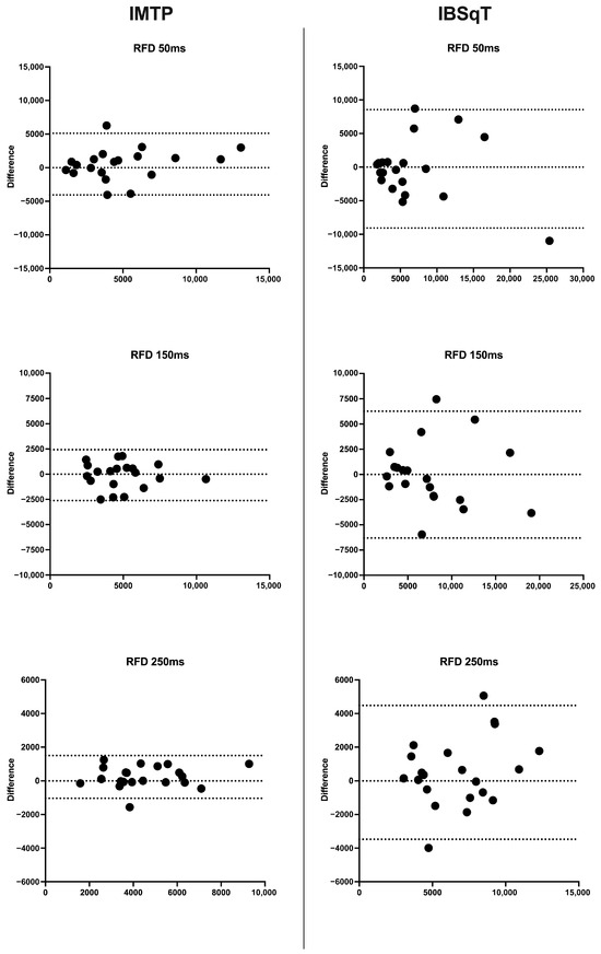 Between-session IMTP SEM, SWC0.2, and effect size (ES), are presented in Table 3. Similar to intra-session tests, PF and RPF demonstrated excellent reliability values (ICC = 0.96; 0.99) and acceptable variability (5.3–3.2%). Force at all its time points demonstrated good reliability (ICC = 0.77; 0.84) with variability values around 10.8–13.6%. For RFD, ICC values range from poor to excellent (0.33–0.94), with CV ranging from 10.1% to 42%. IMP 0–50 ms showed good reliability (ICC = 0.80) and met the acceptable variability criterion (CV = 8.7%), while other time windows showed good reliability (ICC = 0.78–0.79), with CV ranging from 10.3% to 11.8%. Paired t-tests showed no significant differences between test sessions for all kinetic variables (p > 0.05). Additionally, RPF demonstrated good sensitivity to performance changes, with SWC0.2 scoring higher than SEM. For IMTP, the average bias for peak force (PF) was −36.47 N, with a bias SD of 210.9 N and 95% LoA −449.7 N and 376.8 N. For the body mass-relative measurement (PF/BM), IMTP showed an average bias of −0.2802 N/kg, with narrow LoA between −5.714 N/kg and 5.153 N/kg. Regarding the force at 50 ms, IMTP showed a bias of −29.23 N, with an SD of 169 N and LoA between −360.5 N and 302 N. In terms of RFD at 50 ms, IMTP presented an average bias of 531 N, with wide LoA between −4053 N and 5115 N. At 150 ms, the force showed a bias of −43.65 N, with LoA between −602.3 N and 515 N. The RFD at 150 ms showed a bias of −96.52 N, with LoA ranging from −2621 N to 2428 N. For impulse at 150 ms, IMTP showed a bias of −5700 N·ms, with extremely wide LoA ranging from −63,908 N·ms to 52,508 N·ms. At 250 ms, the force showed a positive bias of 33.57 N, with LoA between −629 N and 696.1 N. The RFD at 250 ms showed a bias of 234 N, with LoA ranging from −1033 N to 1501 N. For impulse at 250 ms, IMTP presented a bias of 593.1 N·ms, with LoA ranging from −140,137 N·ms to 141,323 N·ms. All these data are displayed in Figure 3, Figure 4, Figure 5 and Figure 6.