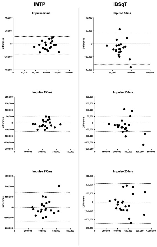 Bland–Altman plots of impulse at different time windows. Dashed lines represent the value of zero and the limits of agreement for the test-retest evaluations.
