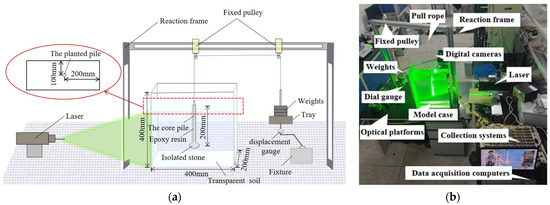 The model test device for the uplift bearing capacity of planted pile foundations based on transparent soil is shown in Figure 1a. The model was prepared to avoid the effects of size, referencing literature [27], which demonstrates that the influence range of static pile loading on surrounding soil is 8R (where R is the pile radius); additionally, considering the maximum transparency of the transparent soil, the internal dimensions of the box are selected as length × width × height = 400 mm × 200 mm × 450 mm, with the model box made from 5 mm thick transparent acrylic sheets. The testing load system consists of a reaction frame, pulling ropes, fixed pulleys, weight trays, and weights. Two fixed pulleys are secured to the reaction frame (one positioned at the center point of the model box, with distances of 200 mm and 100 mm from the edges of the box). One end of the pulling rope is connected to the top of the pile, while the other end passes around the pulley to connect to the weights tray. The upward load is applied to the pile top by incrementally increasing the weights on the weights tray. The pile foundation is located at the center point of the model box, with distances of 200 mm and 100 mm from the length and width edges, respectively. A displacement gauge with a range of 20 mm is placed at the bottom of the weight tray to measure the vertical displacement of the top of the pile under each level of loading. Figure 1b displays the physical diagram of the test apparatus, where the test system primarily consists of an optical platform, model box, laser, loading system, data acquisition system, digital camera, and post-processing system.