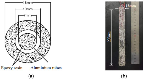Finally, the model was adjusted to have a diameter of 18 mm, with a core pile outer diameter of 10 mm and a wall thickness of 1.5 mm, as depicted in Figure 2a. To ensure that the pile foundation is fully embedded in the soil and meets experimental requirements, a length of 20 cm is chosen for the pile. Additionally, black paint is sprayed on the surface of the aluminum tube to prevent laser reflections that might affect image quality. The model of the pile foundation is shown in Figure 2b.