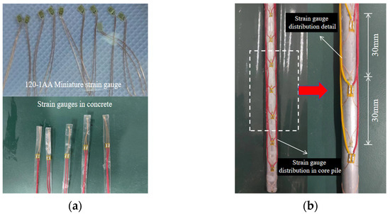 The strain gauges used in this experiment are model 120-1AA micro strain gauges, which have a range of 20,000 microstrains. These strain gauges are mounted within epoxy resin and protected with plastic sheets, as shown in Figure 3a. Seven monitoring sections were arranged along the longitudinal direction from the bottom of the pile on the outer surface of the aluminum tube and in the epoxy resin, with a spacing of 3 cm, and strain gauges were attached to obtain the strain of the pile at those sections. The distribution of the core pile strain gauges is illustrated in Figure 3b. There exists a certain relationship between the strain () of the pile and the load (), as well as the cross-section area () of the pile. By using this relationship (), the axial force of the pile is calculated, allowing for the determination of the axial force distribution in both the core pile and the surrounding concrete.