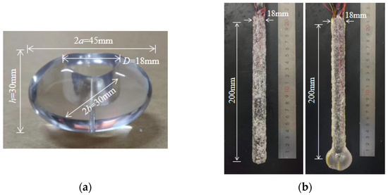 As shown in Figure 4a, the isolated stone is ellipsoidal (with the lengths of the major axis, minor axis, and thickness being 22.5 mm, 15.0 mm, and 30.0 mm, respectively). A cylindrical hole with a diameter of 18 mm and a depth of 15 mm is retained on the surface of the isolated stone for inserting the model pile. To avoid the impact of laser reflections on image analysis, the model isolated stone is made of transparent resin material using 3D printing. The isolated stone-supported pile foundation model is illustrated in Figure 4b.