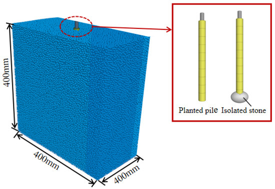 The dimensions of the numerical simulation model are consistent with those of the experimental model, measuring 400 mm in length, 200 mm in width, and 400 mm in height; the coupled model is shown in Figure 5. The numerical coupling model primarily consists of two modules: the pile and the soil. The pile structure uses solid elements from FLAC3D, while the soil employs sphere elements from PFC3D, and the isolated stone is modeled using rigid clusters in PFC3D. After extensive trials, matching particle and wall parameters are selected to form the numerical model. Sand is formed from particles; to improve computational efficiency, the particle diameter in the soil model is set to 3–5 mm. Using the distribute method [29], particles with a porosity of 0.4 are generated in the specified region, resulting in a total of 160,000 particle spheres, with a friction coefficient of 0.4 between the particles. The friction coefficient between the particles and wall elements is set to 0.1 to reduce the friction force exerted by the wall elements on the particle units during equilibrium, thereby minimizing boundary effects.