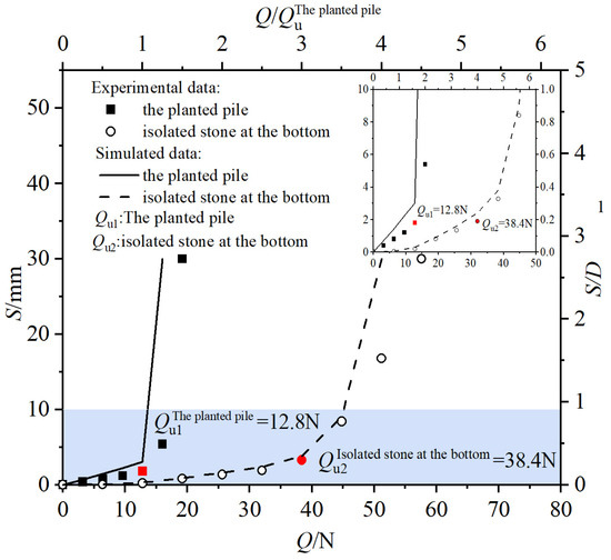 Figure 6 shows that the trends and slope variations of the Q-S curve obtained from the simulation calculations are generally consistent with those obtained from model tests. The Q-S curve of the planted pile exhibits a steep increase with a noticeable inflection point (The points highlighted in red in Figure 6). Before the inflection point appears, the pile head displacement increases slowly with increasing load, but after the inflection point, the displacement of the pile head experiences a sudden change, causing the pile body to rapidly pull out as it reaches its ultimate state; the load at the inflection point can be considered the ultimate pullout load. The load at the inflection point for the planted pile without an isolated stone is 12.8 N, with a corresponding displacement of 2 mm, whereas for the planted pile with an isolated stone, the load at the inflection point is 38.4 N, with a corresponding displacement of 3.5 mm. The Q-S curve for the planted pile with an isolated stone at the base is less steep compared to that without the stone; under the same load of 12.8 N, the pullout displacement of the planted pile with an isolated stone is very small, while the planted pile without the stone has already reached the ultimate pullout displacement of 2 mm. When the pullout displacements are equal, the planted pile with the isolated stone at the bottom bears a greater pullout load. This may be attributed to the presence of the isolated stone, which increases the cross-sectional area, enhancing the vertical support provided by the overlying soil, thus allowing the planted pile foundation to support a larger pullout load.