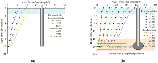 Figure 7 shows that the axial force distribution in the core pile derived from the simulation calculations closely matches that obtained from the model tests. Figure 7a displays the axial force distribution for a core pile without an isolated stone. It is evident that the axial force in the planted core pile decreases with depth, which can be attributed to the downward frictional resistance from the outer concrete acting to hinder the upward pull of the core pile. The axial force curve shows varying rates of decrease at different positions along the pile body. The slope of the axial force curve reflects the magnitude of frictional resistance. Within a 3 cm range from the pile head, the rate of decrease in the axial force curve is highest for the core pile head. This may be due to the greatest displacement difference between the core pile and the outer concrete at the pile head. As the depth increases, the displacement difference between the core pile and the outer concrete gradually decreases, and the internal frictional resistance between the core pile and the outer concrete also decreases and stabilizes. Therefore, the maximum internal frictional resistance for the planted pile occurs at the pile head. This indicates that the deformation of the planted core pile is approximately coordinated with that of the outer concrete. When the load is 6.4 N, the axial force in the lower section of the pile approaches zero, indicating that the end resistance of the core pile is nearly zero, with the load on the core pile primarily borne by side friction resistance. As the load increases, the side friction resistance becomes more pronounced, resulting in an increase in axial force along the pile body, gradually generating axial force in the lower section. Under the applied load, the upper core pile is the first part to engage. As the load progressively transfers down the pile body, it also gradually disperses through the outer concrete of the core pile into the surrounding soil. This creates a dual-layer load diffusion pattern: The load spreads from the core pile to the outer concrete and from the outer concrete to the surrounding soil.