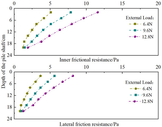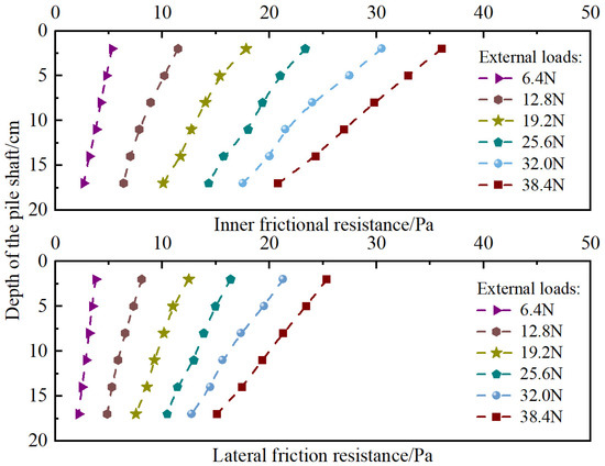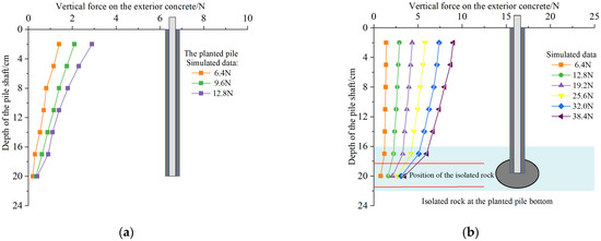 Using an external load of 12.8 N shown in Figure 10 as an example, the internal and external friction forces along the stem of the planted pile without an isolated stone gradually decrease. At a load of 12.8 N, the lateral friction force decreases rapidly with increasing depth, indicating that the lateral soil friction is fully mobilized, suggesting that the load of 12.8 N is the ultimate bearing capacity of the planted pile. Additionally, it can be observed from the figures that the internal friction force is greater than the external friction force, with the internal friction being approximately 1.47 times larger than the external friction, which is about 0.8 times the ratio of the diameters of the planted pile to the core pile (). Therefore, the outer concrete in the planted pile primarily serves to transfer the load.