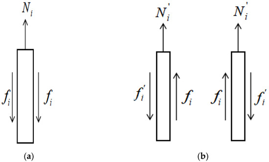 When a planted pile is under tension, the stress conditions at the core axial load, the core–concrete interface, and the concrete–surrounding soil interface are complex. The applied top-of-pile load is first transferred to the concrete through surface friction at the core–concrete interface and then to the surrounding soil through the cement–soil interface [31,32]. Defining the frictional resistance due to relative displacement at the interface between the core column and the outer concrete ring as the internal frictional resistance, while the friction at the interface between the exterior concrete and the surrounding soil is defined as external friction. Figure 9 illustrates the force analysis of the core pile and the outer concrete micro-elements. represents internal friction; represents external friction; and and represent the axial forces in the core pile and outer concrete at the section , respectively.