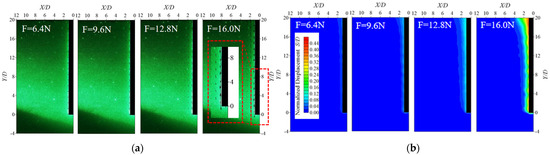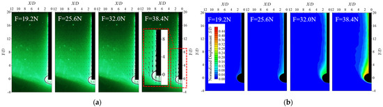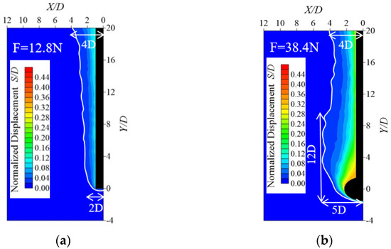 As seen in Figure 12a, with the increase of upward loads, the model piles gradually exhibit upward displacement, and the surrounding soil also tends to move upwards. As the load reaches 16.0 N, the soil around the pile end begins to exhibit downward movement, attributed to the noticeable displacement of the model pile at that point, creating a void area, leading to the re-distribution of the surrounding soil to fill that void. It can also be observed that soil displacement decreases gradually in the direction away from the planted pile, with the maximum soil displacement occurring at the pile top and gradually decreasing downward along the pile stem. With the increase in load, the displacement of the soil surrounding the pile increases, thereby expanding the affected area of the surrounding soil. As shown in Figure 12b, the displacement field of the soil surrounding the pile exhibits an overall “inverted triangular” distribution [33], with the maximum displacement occurring at the pile top and the area of influence being largest there. As the load increases, the affected areas of the surrounding soil in both horizontal and vertical directions gradually expand. The horizontal soil displacement decreases progressively in the direction away from the planted pile, with the maximum displacement of the surrounding soil occurring at the pile top and gradually decreasing down the stem.