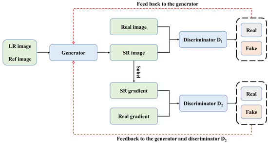 This study aims to enhance the quality of low-resolution (LR) images by reference images (Ref) and proposes a new reference-based super-resolution (RefSR) method based on a generative adversarial network (GAN) named STGAN. The overall workflow of the method is shown in Figure 1, which mainly includes a generator and two discriminators. The objective of the generator is to reconstruct the fine texture in the LR image using the reference image to produce a high-resolution (HR) image. To obtain clear and visually satisfactory super-resolution results, we introduce discriminators and in the image and gradient domains, respectively, where the gradient discriminator aims to focus on the local structure of the image to optimize sharpness and detail reconstruction by analyzing the image gradient information. This strategy inspired by RRSGAN [43] helps the model to accurately infer local intensity changes and better preserve geometric details and texture information. The generator learns finer appearance features and avoids distortion of geometric details by receiving feedback from both discriminators simultaneously. In this way, STGAN not only improves the image resolution, but also ensures the naturalness and accuracy of the reconstructed image, thus meeting the demand for high-quality image reconstruction.