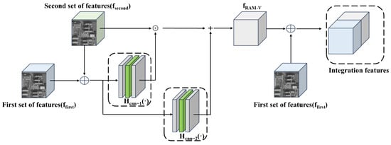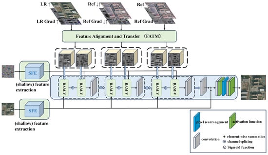 Figure 4. Generator feature alignment and transfer module with dual channels, where the symbol ↑ denotes a dual-triple upsampling process and ↓ denotes a dual-triple downsampling process. X2 represents a cycle of 2 and X4 represents a cycle of 4.In the RefSR method, the module is designed to process multiple input data streams, including low-resolution (LR) images, reference (Ref) images, and their corresponding gradient maps, separately. Processing a set of corresponding images and gradient maps at a time allows the module to simultaneously analyze and integrate information from different sources, thus significantly improving the quality of the super-resolution reconstruction. By fusing local and global information, the module not only enhances the overall performance of the image, but also uses the gradient information to further optimize the edge and texture details, resulting in more accurate feature alignment and generating more natural and realistic visual effects. - High-quality remote sensing image reconstruction moduleInstead of simply merging various image features as well as gradient feature map features, we employ a fine-grained feature fusion strategy. Our goal is to enhance the correlation between the two features while suppressing the less correlated information to optimize the texture transfer process. As shown in Figure 5, the first and second set of features are first fused at the channel layer, and then attention maps are generated through a series of convolutional layers. These attention maps are normalized by a sigmoid function and elementwise multiplied with the second set of features to strengthen the correlation between them. Next, the attention maps are again convolved and the results are summed with the previous results to further enrich the features. Finally, the enriched features are fused with the first set of features at the channel level to provide more accurate and enriched information for the subsequent texture transfer process. The Robustness Augmentation Module (RAM-V) is employed, the equation of which can be expressed as:where denotes the summed enriched features, and denote the first set of features and the second set of features, respectively, and and denote the computation including convolutional layers.