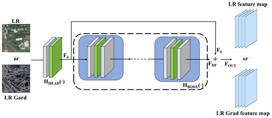 - Feature extraction module (SFE):Given a low-quality (LR) input (where H, W, and C are the image height, width, and the number of input channels, respectively), as shown in Figure 3, a convolutional layer (using a 3 × 3 convolutional kernel as well as a Leaky ReLU activation function) is firstly utilized to extract the shallow feature as: , and secondly, the deep feature as:where consists of multiple residual blocks (ResBlocks). Each residual block contains two convolutional layers inside, both of which use a 3 × 3 convolutional kernel and the same number of filters to ensure that the dimensionality of the input and output is consistent. It has been shown [44,45] that deep convolutional networks help to improve super-resolution performance. Finally, the shallow feature and the deep feature are summed up by residual concatenation to obtain the final output feature: . The design of the residual block is crucial when training deep networks, as it effectively mitigates the problems of gradient vanishing and gradient explosion, ensuring that information can be effectively passed through the network. In addition, the role of the SFE module is to perform shallow feature processing, and it is capable of performing image feature extraction and gradient map feature processing independently, respectively.