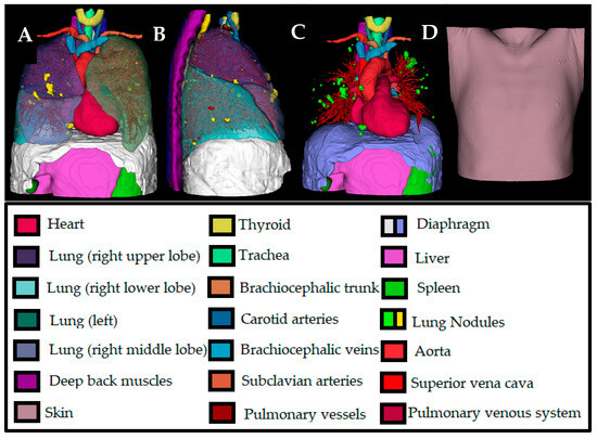 The CT dataset was imported into 3D Slicer (Version 5.6.1, MA, USA) and segmented using manual techniques by harnessing thresholding for the skin, subcutaneous fat, muscle, diaphragm, lung nodules, and pulmonary arteries. TotalSegmentator [27], a 3D slicer extension tool, was used to automatically segment the lungs, heart, vessels, trachea, oesophagus, thyroid, bones, stomach, spleen, pancreas, and liver. Furthermore, the lungs, oesophagus, and stomach were manually hollowed using SegmentEditorExtraEffects [28]. The 3D volume rendered (VR) model (Figure 1) was then converted into stereolithography (STL) files.