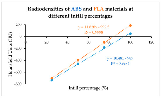 Radiodensities of ABS and PLA materials at different infill percentages.