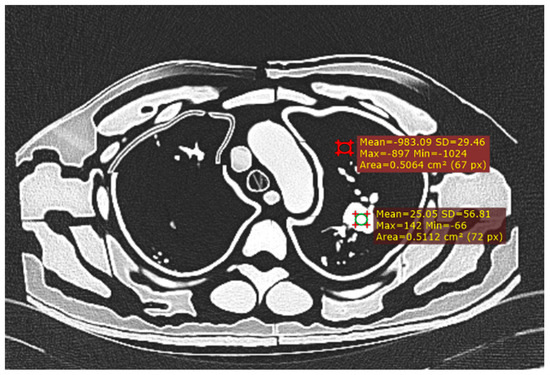 The mean HU was measured in the biggest nodule compared to the background lung tissue, taking care to avoid surrounding vessels. Image noise was calculated as the standard deviation from a 0.5 cm2 ROI in the lung tissue [40]. Figure 3 demonstrates an example of the measurements taken to calculate CNR.