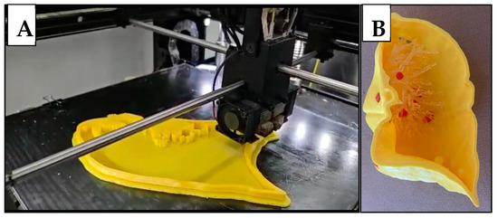 Lung shell. (A): Successive layering of PLA during FDM printing of the lung. (B): Right anterior lung compartment with lung vessels (polyurethane resin) and nodules (red PLA) in situ.