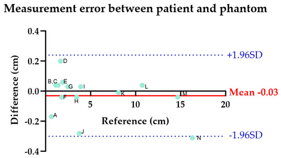 Bland–Altman analysis used to determine geometrical differences between the CT scans of the 3D-printed phantom and reference patient. (A) Skin, (B) body of the pancreas, (C) subcutaneous fat, (D) pancreatic head, (E) muscle, (F) trachea, (G) largest lung nodule, (H) descending aorta, (I) pulmonary vessels, (J) pulmonary trunk, (K) aortic arch, (L) heart, (M) lung, (N) sternum. The measured bias was −0.03 ± 0.14 cm (limits of agreement from −0.3 to 0.24 cm).