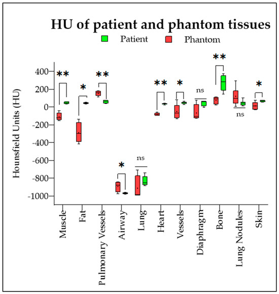 Box plot comparing the Hounsfield Units (HU) of phantom and patient tissues. Statistical significance is denoted as follows: ** indicates differences with p < 0.001, * indicates differences with p < 0.05, and ns indicates no statistically significant difference, representing radiation equivalence. Lung nodules, diaphragm, and lung tissue have similar HU values. In contrast, phantom muscle, fat, heart, skin, blood vessels, and bone have significantly lower HU compared to the patient, whilst pulmonary vessels and airway have significantly higher HU. Phantom tissues tend to exhibit larger variations in attenuation.