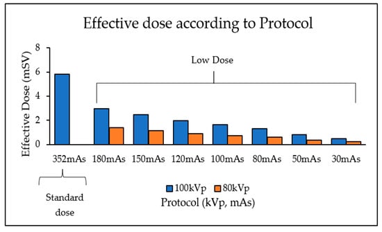 Bar graph demonstrating that a reduction in kVp and mAs results in a reduced effective dose.