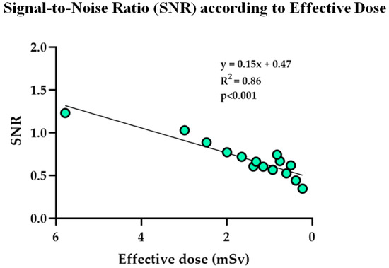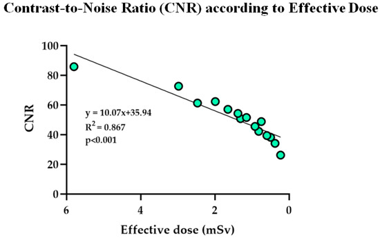 A reduction in kVp and mAs led to a corresponding decrease in effective dose (Table 4, Figure 9). The lowest dose protocol (80 kVp and 30 mAs with resultant 0.23 mSv) delivered a 96% lower effective dose compared to the standard protocol (100 kVp and 352 mAs with 5.8 mSv). However, this reduction was accompanied by a 72% decrease in SNR and a 69% reduction in CNR (Table 4). Additionally, 86% of the reduction in SNR was explained by the decrease in effective dose, with results demonstrating a significantly strong positive linear correlation between SNR and effective dose (r = 0.927, R2 = 0.86, p < 0.001) (Figure 10 and Figure 11). Likewise, 87% of the reduction in CNR was explained by the reduction in effective dose, with a significantly strong positive linear correlation (r = 0.931, R2 = 0.87, p < 0.001) (Figure 12 and Figure 13). Regardless of this diminishing objective assessment of image quality, the subjective image quality scores did not differ between these scans, scoring on average 4/5 representing good diagnostic confidence (κ = −0.398 (95% CI, −0.644 to −0152), p < 0.002) (Table 4, Figure 14).