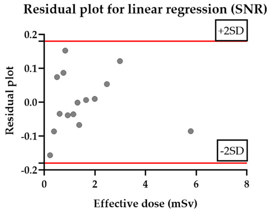 Residual plot for the linear relationship between signal-to-noise ratio (SNR) and effective dose. All data points lie within 2 standard deviations (SD) of the expected values, demonstrating a good fit to the linear model.