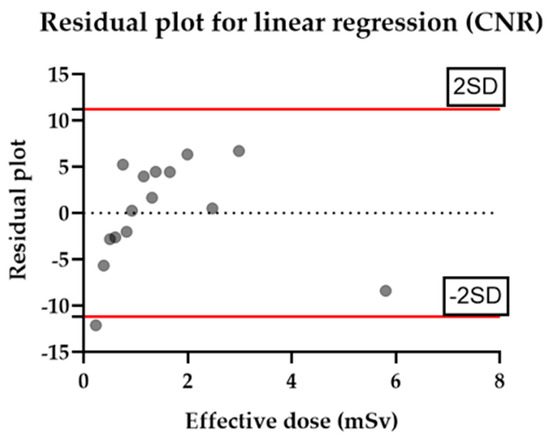 Residual plot for the linear relationship between contrast-to-noise ratio (CNR) and effective dose. Most data points lie within 2 standard deviations of the expected values. The residuals exhibit normality (p > 0.05, Shapiro–Wilk test, GraphPad Prism version 10.4.1), indicating a good fit to the linear model.