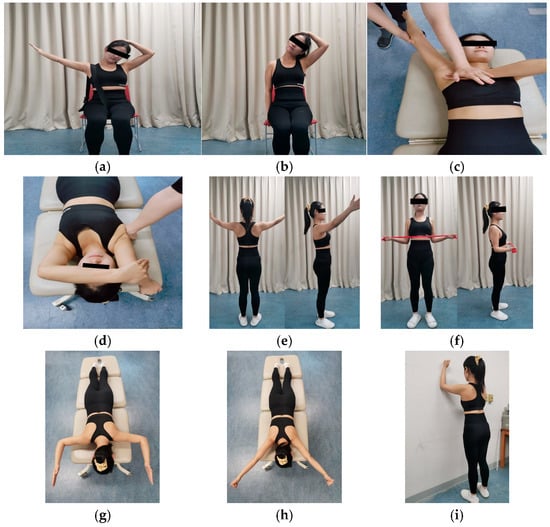 (a) Levator scapular stretching; (b) upper trapezius stretching; (c) pectoralis minor stretching; (d) teres major stretching; I push-up exercises; (f) bilateral external rotation; (g) L-exercises; (h) Y-exercises; and (i) wall-slide exercises.