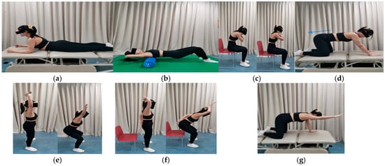 (a) Rectus abdominis stretching; (b) thoracic mobility exercises; (c) thoracic extensor muscle strengthening; (d) backward-rocking exercise; (e,f) posture exercise; and (g) thoracic-stabilization exercise.