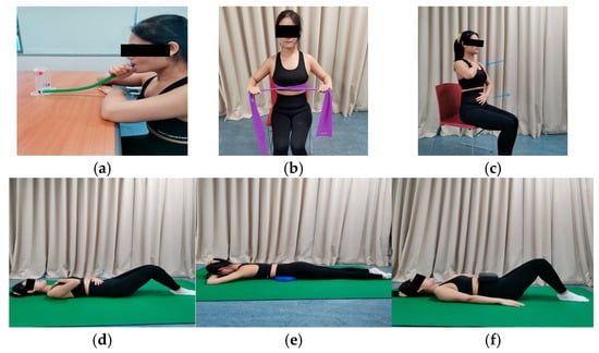 (a) Inspiratory training; (b) costal expansion; and (c–f) diaphragmatic breathing exercises.