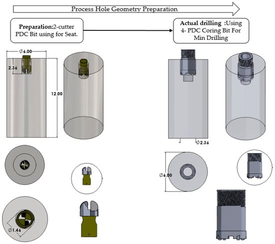 Un-per-drilling with 2-cutter PDC Bit: As seen in Figure 2, the experiment’s initial phase involved pre-drilling operations using a specific 2-cutter PDC bit made just for this purpose. Un-per drilling is the first step in preparing the rock formation for further drilling or coring operations by making a small hole.