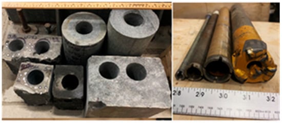In the second stage of this study, a thorough protocol was developed to track the drilling parameters’ reactions amid diverse bit–rock interactions in a laboratory setting, as shown in Figure 3, which displays gabbro samples of various sizes and shapes chosen for the primary drilling tests. These samples (to the left of Figure 3) are cut from the same larger gabbro block to guarantee consistency in material properties and characteristics. During the drilling process, cuttings were collected using the chosen gabbro samples. Rock fragments, known as cuttings, are created during the drilling process. They are crucial for deciphering the bit–rock interactions and assessing the drilling performance. The gabbro samples are prepared for multiple diameter holes using three coring bits. The drilling locations for the ensuing examinations and experiments are these holes. The coring bits are chosen according to their outer diameters to create holes of varied sizes and depths. After the multi-diameter holes are prepared, drilling tests are conducted with a 5-cutter Polycrystalline Diamond Compact (PDC) bit (to the right of Figure 3).