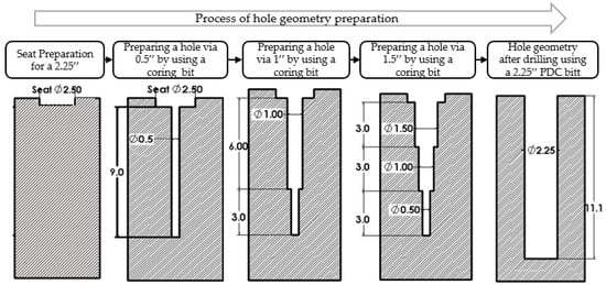 Stage 1: Two central areas of study were determined for each sample, and both were cored under identical conditions using the PDC cutter coring bit. The top section of each region was parallel to an immediate pre-cored hole created by the 2-cutter PDC bit, while the bottom section was cored parallel to an un-pre-cored section. Testing repeatability was important for all experiments in this research to ensure the data were consistent and accurate. Each test was repeated thrice under the same conditions and parameters. Using this method, researchers could minimize the effects of variability and confirm the results.