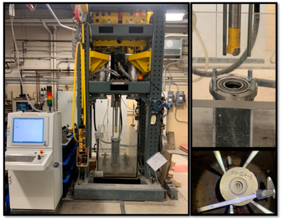 In addition, the type of rock is gabbro, which was used in the experiments to investigate further the pre-drilling effect on drilling performance in different rock types. Drilling in was performed to assess the impact of weaker formations on drilling parameter responses compared to stronger formations like gabbro (Table 3). Samples 6 inches (15.24 cm) in diameter and 12 inches (30.48 cm) in length, cored from the rock blocks with thorough characterization reported in de Moura, were used in this study [16]. The experimental setup is shown in Figure 1. It involved three main stages.