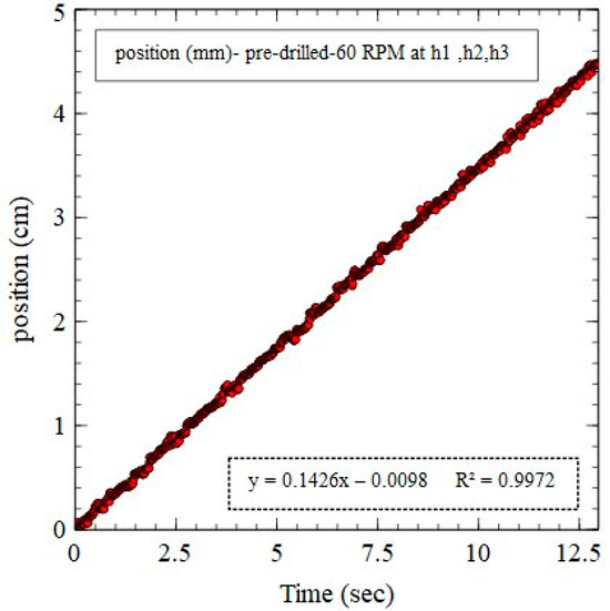 Figure 6 shows the cutter position versus time during drilling operations. The data were obtained from the position sensors within the Large Drilling Simulator (LDS), which continuously monitored the axial displacement of the cutter. The purpose of Figure 6 is to validate the repeatability of the experimental conditions and establish a basis for analyzing drilling performance like Rate of Penetration (ROP). While the linear relationship may seem obvious given constant Weight on Bit (WOB) and rotation rates, it is important to ensure that no external factors, such as fluctuations in the Weight on Bit (WOB), rotation rate, or irregularities in the drilling setup, influence the experiments.