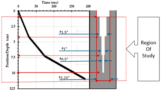 Data relevant to drilling operations are shown in Figure 7, which includes parameters like position (in cm) and time (in seconds). These data calculate the Rate of Penetration (ROP) using the position and time parameters. Instead of horizontal lines, as in Figure 8, dashed red vertical lines indicate different sections. The data collected from these experiments provided valuable insights into optimizing drilling operations in complex geological formations.