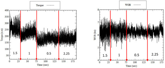 The Weight on Bit (WOB) amplitudes exhibit the observed variations, indicating that the WOB influences the interaction between the rock formation and the drilling bit. WOB amplitudes are higher when the bit–rock interaction is lower (i.e., less bit–rock interaction) and lower when the bit–rock interaction is higher (i.e., more bit–rock interaction).