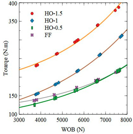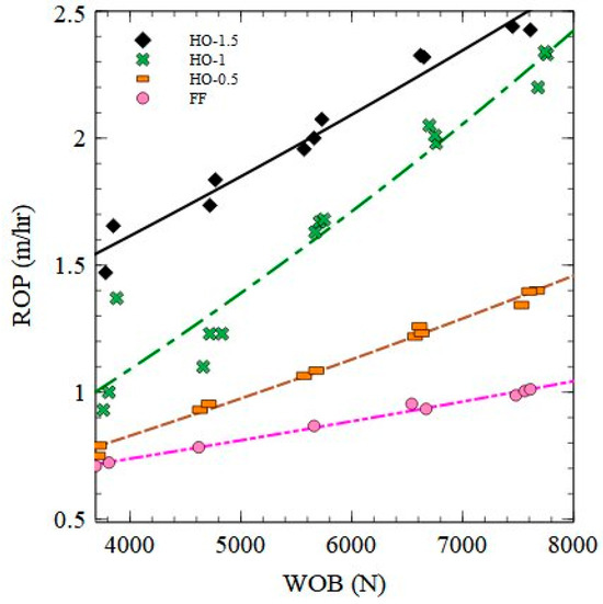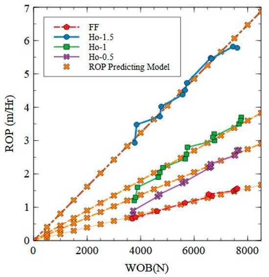 Figure 9 presents the ROP achieved for four configurations: drilling with a full-face bit in pre-cored holes (HO) of 1.5, 1.0, and 0.5 inches in diameter, as well as drilling without a pre-cored hole (full-face). The results indicate a consistent trend of increasing ROP with increasing Weight on Bit (WOB) across all configurations. Notably, in both rock types, the ROP is higher for larger pre-cored holes (HO) (1.5 and 1.0 inches) than for smaller holes (0.5 inches) and the full-face configuration. This suggests that pre-coring can significantly enhance drilling efficiency. However, the Rate of Penetration (ROP) increase is not always consistent or proportional to the increase in hole diameter, suggesting that other factors might also play a role in multi-diameter hole drilling performance.
